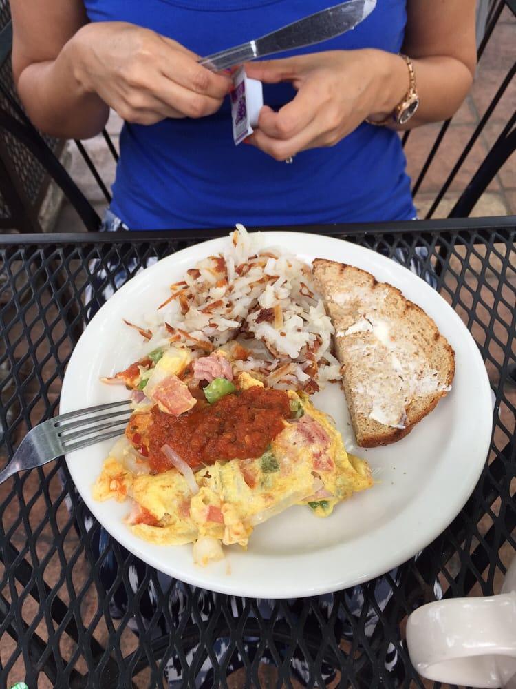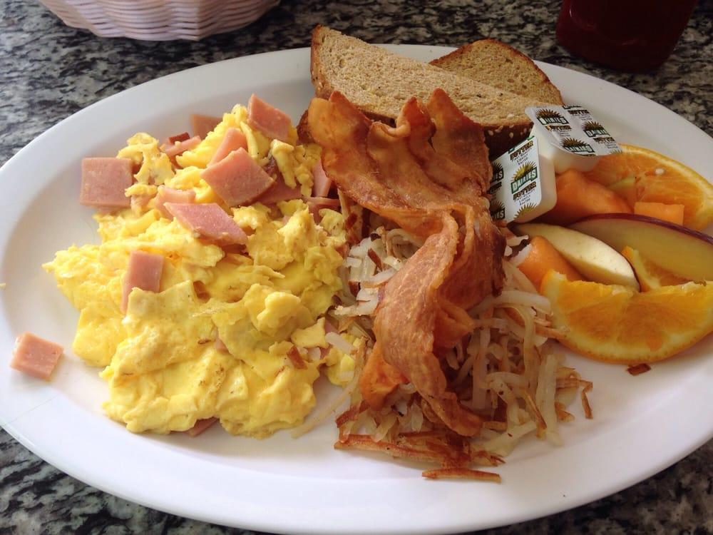 Server was friendly. Lights and other items had a lot of dust on them. Slightly expensive but the portions are generous. (Only had breakfast food.) Didn't like the OJ. But the bacon was good. Fruit was fresh.